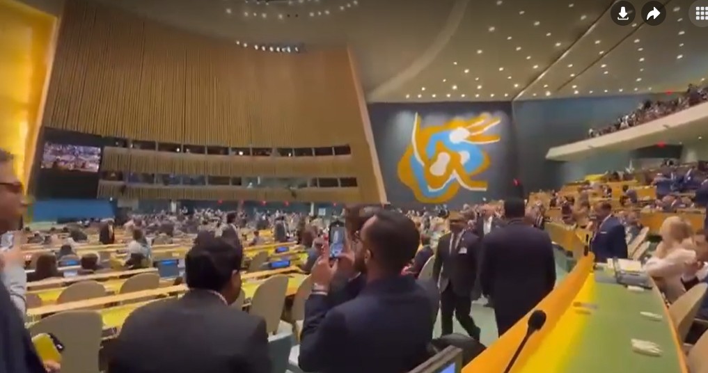އދ. ގެ ޖެނެރަލް އެސެމްބްލީގައި މިހާރު ކުރިއަށްދާ ޖަލްސާގައި އިސްރާއިލުގެ ބޮޑުވަޒީރު ބެންޖަމިން ނަތަންޔާހޫ ވާހަކަ ދައްކަން ފެއްޓެވުމާއެކު އެ ޖަލްސާގައި ތިއްބެވި ރާއްޖޭގެ ވަފުދުގެ ހުރިހާ ބޭފުޅުން ޖަލްސާއިން ނިކުމެވަޑައިގެންފި އެވެ.
