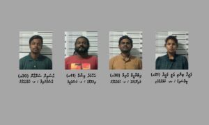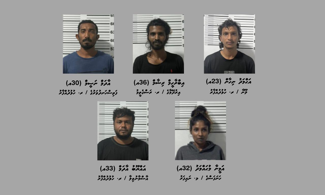 އަދި އަމީނާ މުޙައްމަދު (32އ) އާއި އައްޔޫބު އާދަމް (33އ) އާއި ފަރީޙާ ބިންތި ޢަލީ ވަޙީދު (21އ) އާއި އަޙްމަދު ވިޝާމް (41އ) އަދި ޙުސައިން ސަރްޙާން (30އ) ވަނީ 30 ދުވަހަށް ބަންދުކުރުމަށް އަމުރުކޮށްފަކަމަށް ފުލުހުން ބުނެފައިވެއެވެ.
