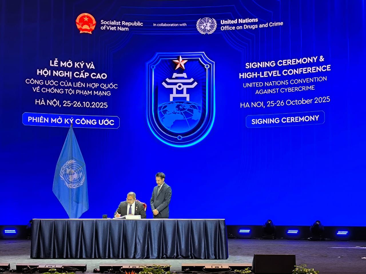 ސައިބަރ ކްރައިމް ހުއްޓުވުމަށް ޤައުމުތަކުން އަޅަންޖެހޭ ފިޔަވަޅުތައް ބަޔާންކޮށް، ސީރިއަސް ކުށްތަކަށް އިލެކްޓްރޯނިކް ހެކި ފޯރުކޮށްދިނުމުގައި ބައިނަލްއަގުވާމީ އެއްބާރުލުން އިތުރުކުރުމަށް އެހީވެދޭ މި މުއާހަދާގައި ޤައުމުތަކުން ސޮއިކުރަން ފަށާފަމިވަނީ ސައިބަރ ކްރައިމްއާ ދެކޮޅަށް، ވިއެޓްނާމްގެ ހަނޯއީގައި ކުރިއަށްދާ ހައިލެވަލް ކޮންފަރެންސްގެތެރެއިންނެވެ. ދިވެހިރާއްޖޭގެ ފަރާތުން ސޮއިކުރެއްވީ ޚާރިޖީ ވަޒީރު ޑރ. ޢަބްދުﷲ ޚަލީލްއެވެ.