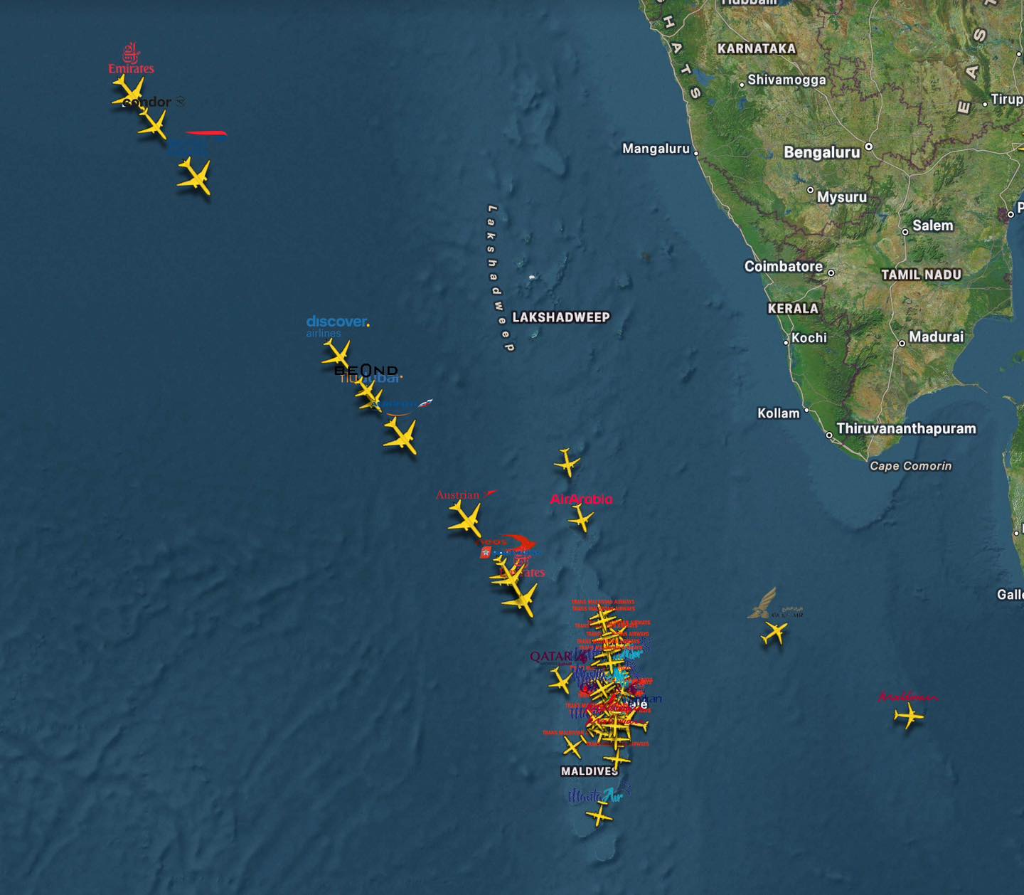 ފްލައިޓް ރާޑާއިން ފެންނަ ގޮތުގައި ރާއްޖެއަށް ޖައްސަން ކިޔޫ ހަދާލާފައި ވަނީ ދުނިޔޭގެ އެންމެ މަޝްހޫރު އެއަރލައިންތަކުގެ ފްލައިޓްތަކެވެ.
